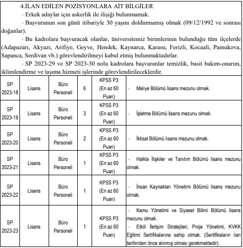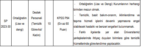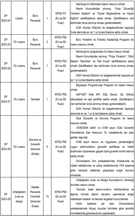 Sakarya Uygulamalı Bilimler Üniversitesi (SUBÜ), 2022 yılı Kamu Personeli Seçme Sınavı (KPSS) ile Sözleşmeli Personel alımı için ilana çıktı.Resmi Gazete’de yayımlanan ilanla; 15 adet lisans mezunu büro personeli, 3 adet ön lisans mezunu büro personeli, 1 adet ön lisans mezunu tekniker, 5 adet ön lisans mezunu erkek koruma ve güvenlik görevlisi, 15 adet lise ve dengi mezunu erkek destek personeli, 10 adet lise ve dengi mezunu kadın destek personeli olmak üzere toplam 49 personel alınacak.BAŞVURULAR VE SONUÇLARİlanlara başvurular 24 Kasım Cuma başlayacak ve 8 Aralık Cuma günü mesai bitiminde sona erecek. 18 Aralık Pazartesi günü ilan edilecek sonuçlar ve tüm detaylar https://ilan.subu.edu.tr adresinden takip edilebilecek.