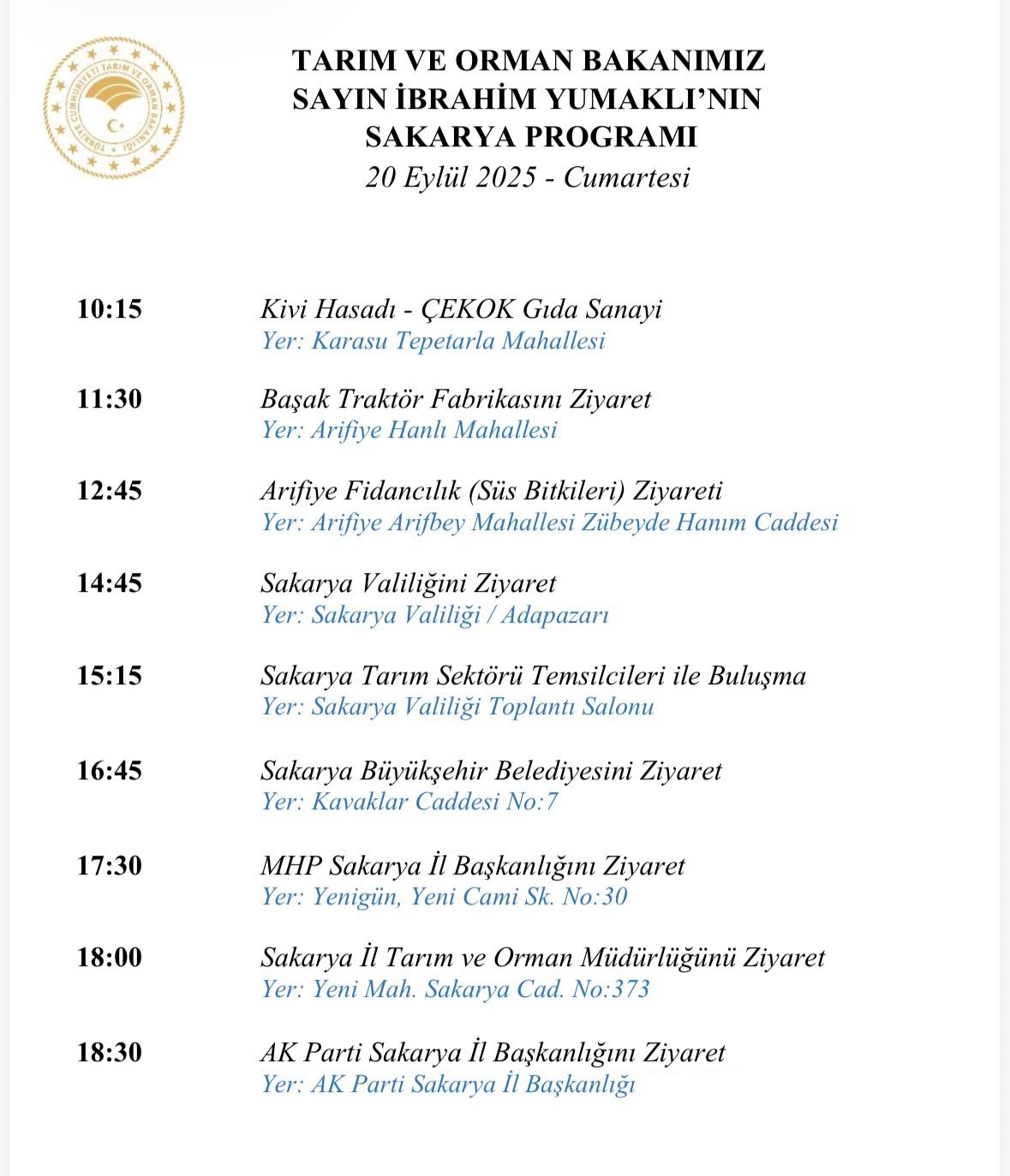 Bakan Yumaklı’nın yoğun programında hem tarımsal üretim alanları hem de yerel yönetimler ve siyasi parti temsilcileriyle görüşmeler yer alıyor.Program, saat 10.15’te Karasu Tepetarla Mahallesi’nde kivi hasadı ile başlayacak. Ardından 11.30’da Arifiye Hanlı Mahallesi’nde Başak Traktör Fabrikası, 12.45’te ise Arifiye Fidancılık (Süs Bitkileri) ziyaret edilecek.Öğleden sonra ziyaretlerine devam edecek olan Bakan Yumaklı, 14.45’te sakarya Valiliği, 15.15’te Sakarya Tarım Sektörü Temsilcileri ile toplantı gerçekleştirecek. Program kapsamında 16.45’te Sakarya Büyükşehir Belediyesi de ziyaret edilecek.Siyasi temaslarda da bulunacak olan Yumaklı, 17.30’da MHP Sakarya İl Başkanlığı’nı, ziyaret edecek.Saat 18.00’de Sakarya İl Tarım ve Orman Müdürlüğü'nü ziyaret edecek olan Bakan Yumaklı, günün son programında saat 18.30’da ise ak parti Sakarya İl Başkanlığı’nı ziyaret edecek.Tarım ve Orman Bakanı İbrahim Yumaklı’nın ziyaret programının ardından Sakarya’dan ayrılacak.