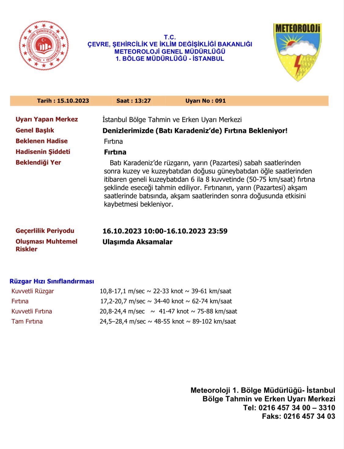 Sakarya Valiliği, Meteoroloji Genel Müdürlüğü’nün verilerine göre yarın etkili olması beklenen fırtına nedeniyle uyarıda bulundu.Meteoroloji’nin verilerine göre, Batı Karadeniz’de rüzgarın, Pazartesi gününün ilk saatlerinden itibaren kuzey ve kuzeybatıdan, doğusu güneybatıdan, öğle saatlerinden itibaren geneli kuzeybatıdan 6 ila 8 kuvvetinde 50 ile 75 kilometre hızla fırtına şeklinde eseceği tahmin ediliyor. Aynı gün akşam saatlerine kadar etkili olacağı değerlendirilen fırtına sebebiyle meydana gelebilecek ulaşımda aksamalar gibi olumsuzluklara karşı dikkatli ve tedbirli olunması uyarısında bulunuldu.