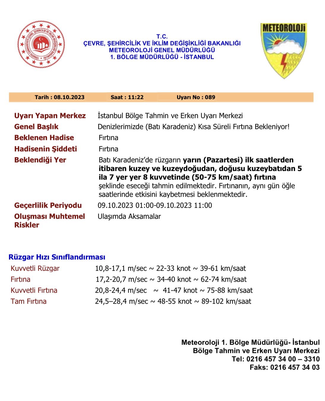 Sakarya Valiliği, Meteoroloji Genel Müdürlüğü’nce yapılan son değerlendirmelere göre, Batı Karadeniz’de rüzgarın yarın günün ilk saatlerinden itibaren 7 yer yer 8 kuvvetinde 50 ile 75 kilometre saat hızla fırtına şeklinde eseceğinin tahmin edildiğini bildirdi. Aynı gün öğle saatlerine kadar etkili olacağı düşünülen kısa süreli fırtına nedeniyle meydana gelebilecek ulaşımda aksamalar gibi olumsuzluklara karşı dikkatli ve tedbirli olunması istendi.