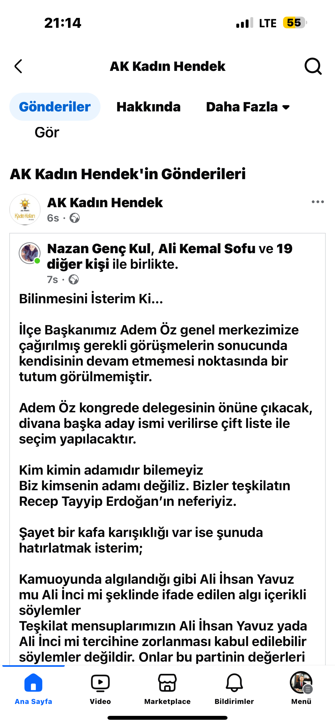 DOĞRU OLDUĞUNA İNANSAYDINIZBu yanlış ve yanıltıcı paylaşımlarla ilgili gereken yerlere şikayetlerimizi yaptıktan beş Saat Sonra 19:17 de;“ Bilinmesini isterim ki...ilçe Başkanımız Adem Öz genel merkezimize çağırılmış gerekli görüşmelerin sonucunda kendisinin devam etmemesi noktasında bir tutum görülmemiştir.”Bu şekilde düzenleme yaparak kendilerince Yalanlarını Düzeltmeye çalışmışlardır.Saat 14:13 ‘te İlk Yaptıkları paylaşım doğru ise neden değiştirmişlerdir?Kaldı ki bu söylemleri bile Genel merkezin adayı biziz Algısını çağrıştırmaktadır.Bende Bütün Delegelerimizin bilmesini isterim ki !!!AK Parti Genel Merkezimiz Hendek İlçemizdeki Olağan İlçe başkanlığı Kongremizde Aday göstermemiş, Aday olanları delegelerin oyları ile belirlenmesi kararı almıştır.