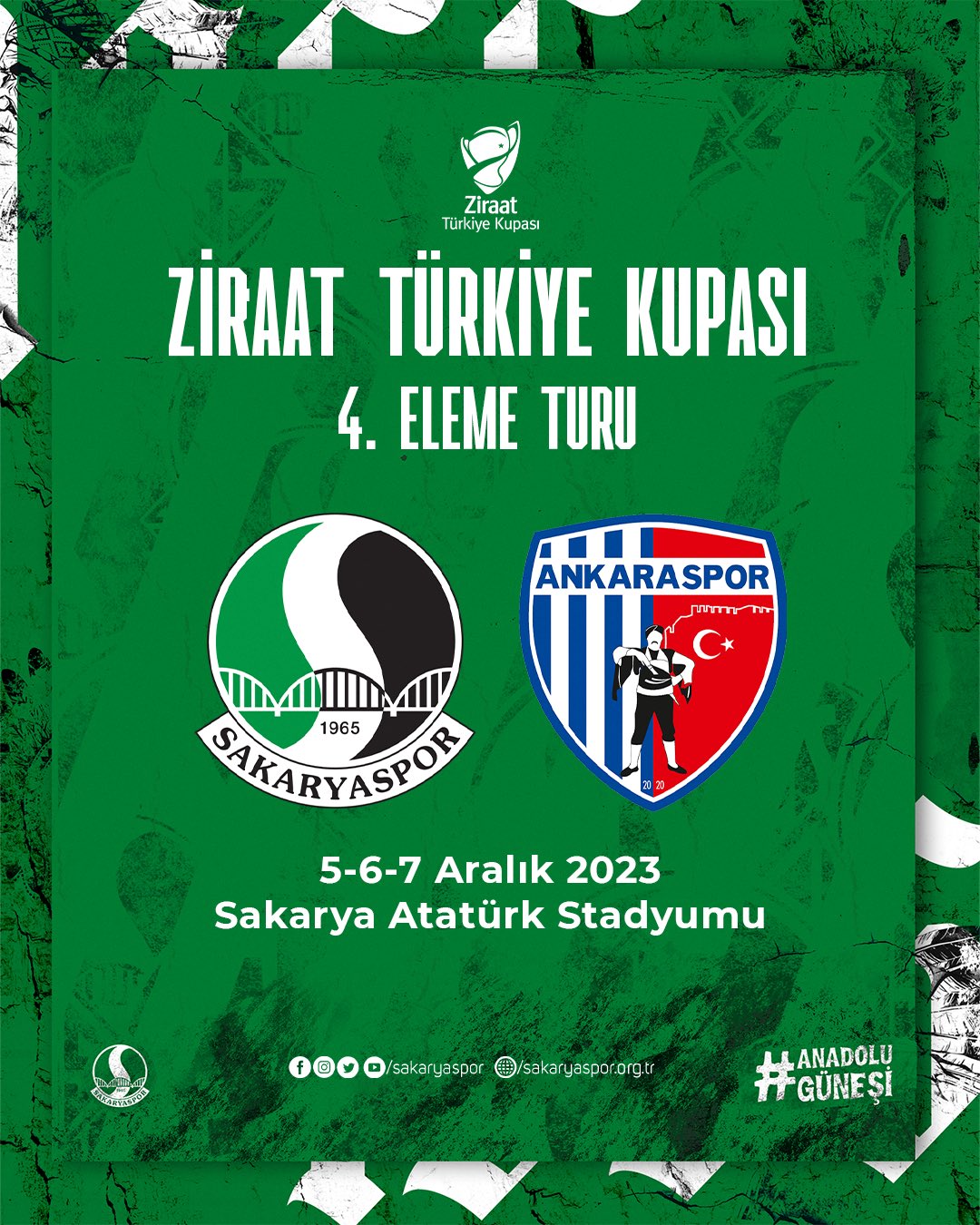 Riva'daki Hasan Doğan Milli Takımlar Kamp ve Eğitim Tesisleri'nde gerçekleştirilen kura çekimine TFF yetkilileri ile ve kulüp temsilcileri katıldı.Kura sonucu Ziraat Türkiye Kupası 4. Eleme Turu'nda Sakaryaspor'un rakibi Ankaraspor oldu. "Ziraat Türkiye Kupası Türkiye'yi Kucaklıyor" sloganıyla bu yıl 52.'si düzenlenen Ziraat Türkiye Kupası'nda 4. tur kura çekimi Milli Olimpiyat Komitesi Olimpiyat Evi'nde gerçekleştirildi. Maçlar 3-4-5 Aralık'ta oynanacak.TÜRKİYE KUPASI 4. TUR EŞLEŞMELERİ Sakaryaspor-AnkarasporTrabzonspor - Çorum FK